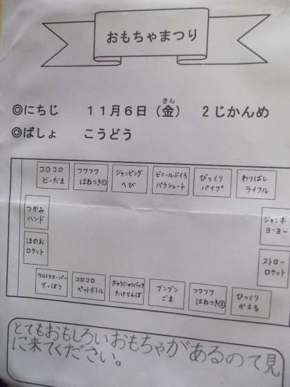 「おもちゃまつり」の招待状を2年生の人からいただきました。明日の2時限目に体育館で開催されます。たくさんの手作りおもちゃのコーナーが記載されています。