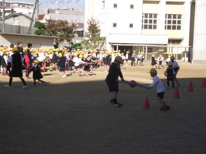 今日の児童集会は「ボールリレー」です。まずは、集会委員が見本をしてから、みんなで、棒とボールを使ってリレーを楽しみました。