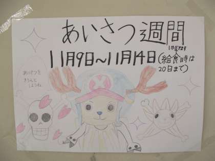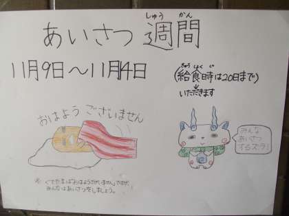 11月9日より、後期児童会のメンバーが中心になって「あいさつ」運動が展開されます。朝や給食をとりに行った時と返す時、家に帰る時など、挨拶が飛び交います。