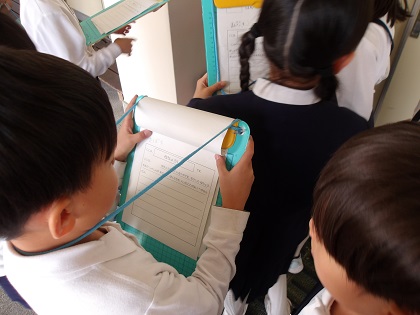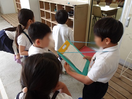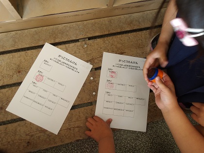 図書室や音楽室などの前に置いているスタンプを押して、たくさんの教室を回りました。