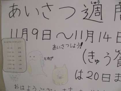 今日(11月9日)から、児童会主催の「あいさつ週間」がスタートしました。登校時や給食時、下校時等にキャラクターも登場しながら「あいさつキャンペーン」が展開されるようです。
