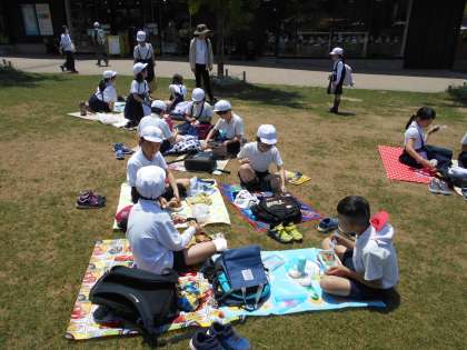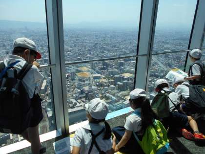 3年生が校外学習であべのハルカスにいってきました。環状線に乗って天王寺へ。東西南北の景色を見て、気づいたことをワークシートにかきました。お弁当は天王寺公園で食べました。