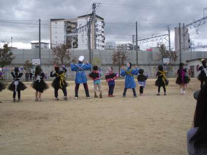 黒の衣装に青の法被。ひょっとこお面も揺れてます。