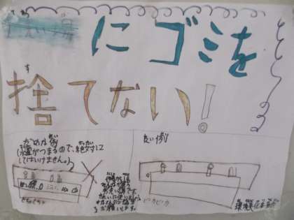 環境美化委員会のポスターが啓発しています。手洗い場をきれいに正しく使おうと。