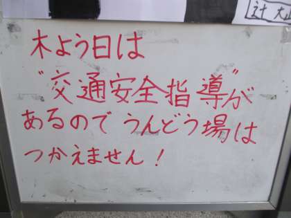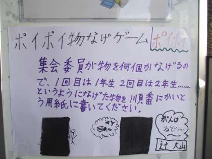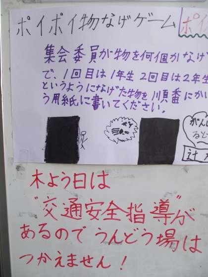 今週の集会は「ポイポイ物飛び、ちら見ゲーム」とのことです。次週は「アニマルリレー」と宣伝してましたが、交通安全学習が運動場であるので、内容変更とのことでした。