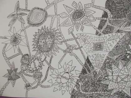 黒のサインペン1本で、いろいろな線のひき方を練習して、葉っぱや枝などを想像して描いていったそうです。写真の撮りやすい低い位置に掲示されていた作品のみ撮影しました。