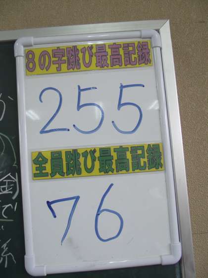 このクラスの大なわでの「八の字とび」最高記録は255回。「全員とび」の最高記録は76回です。今の所。