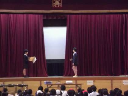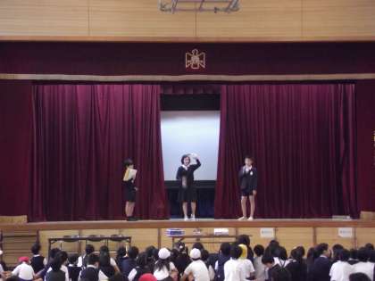 今日は、幕と幕の間を飛んだものを当てるゲームです。見えている時間は1秒あるかないか。各グループ毎に学年毎で答えを用紙に書いていきます。1年生の答えは「上靴」でした。