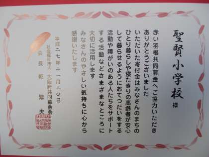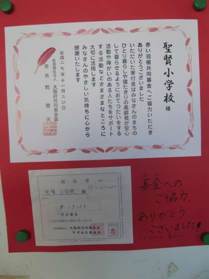 「赤い羽根募金」ご協力ありがとうございます。担当の先生が感謝状等を職員室前に貼りました。