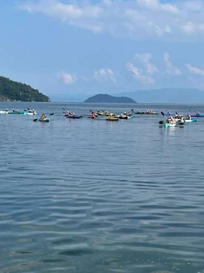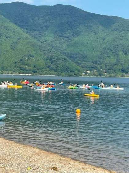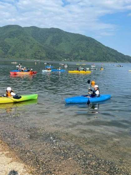 カヤックの様子です、宿舎の方の説明をしっかりと聞き、ライフジャケットを身につけて活動をしました。みんな上手に乗っていました。