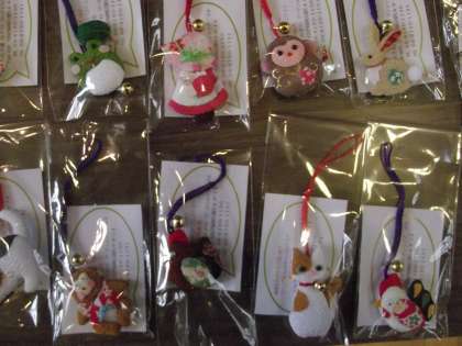 障がいのある皆さん方が作成している商品です。売れ筋は干支の作品とか。京都方面の土産物店では500円を超えているとか。工房では280円くらいで販売しているとも。