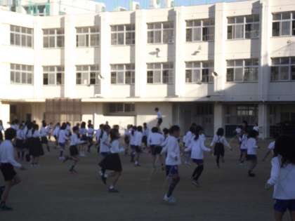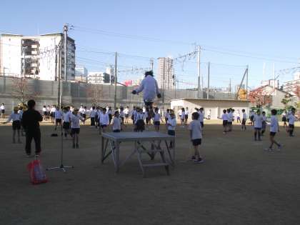 今日は、高学年の「なわとび集会」。運動委員会が朝礼台の上や、みんなの前に出てお手本です。