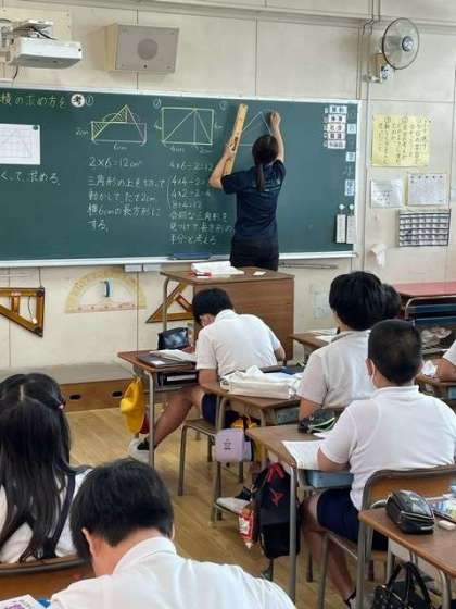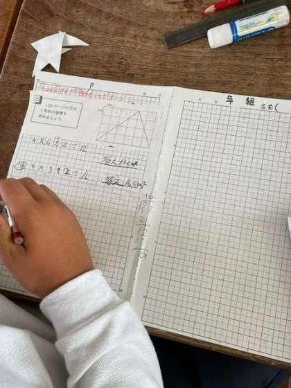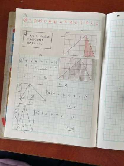 今、算数では、「三角形の面積の求め方について」学習をしています。公式の前に、長方形から考えて、三角形の面積はその半分であることを正しく理解して求めていました。