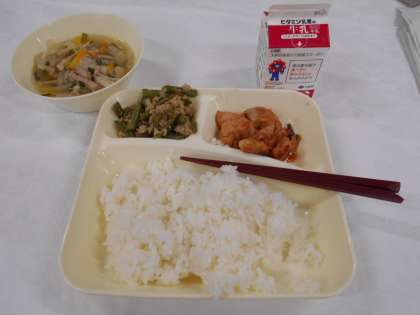 6年生が修学旅行に出発した本日、PTA活動の給食試食会を行いました。メニューは、鶏肉のチリソース、焼き豚のスープ、ツナとさんどまめのオイスターソースいため、ごはん、牛乳。「おいしい」と久しぶりに食べる給食話で盛り上がっていました。