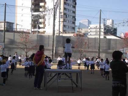 朝礼台やみんなの前で「運動委員」がお手本を見せます。小さいお友達は、一生懸命跳びまくります。