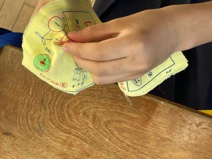 児童は、練習布を使用して、なみ縫い・本返し縫い・はん返し縫い、ボタン付けをしています。動画を見ながら練習したり、友達からおしえてもらったりもしています。
