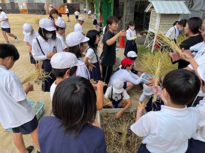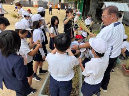 今日の休み時間に、5年生の有志の児童が、稲刈りをしました。