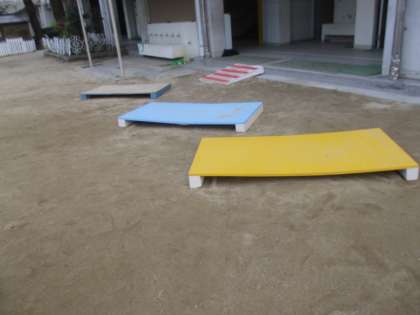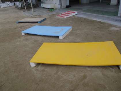 昨日の児童朝会で体育の先生が、「今度の『なわとびジャンプ台』は板を少し薄くしてもらったので、一人ずつ順番に優しく使いましょう」とおっしゃたばかりなのに、いきなり割れて補修されていました。