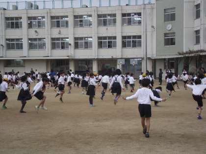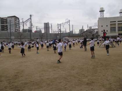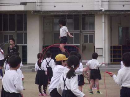 運動委員のお兄ちゃんお姉ちゃんの見本を見て「前とび」、「後ろとび」、頑張ります。