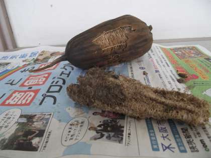 からっからのへちまでした。緑のへちまは4年生の子どもたちが絵に描いて教室に貼ってあります。