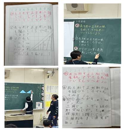 長方形や正方形の紙を対角線にそって切ると、直角が1つある三角形ができることを確認していました。この後、三角定規にも直角があることと結び付けていました。
