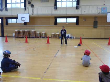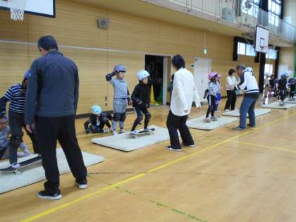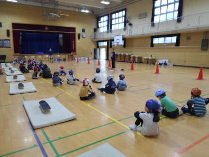 2年生がスケボーを体験しました。木川南小学校の山内校長先生が、まずは立ち方を説明してくださり、マットの上にのせたスケボーの上に立ち、体重を右へ左へ移動させる練習からしました。