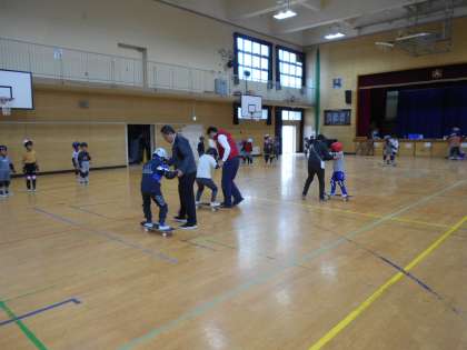 実際にスケボーに乗ってみました。バランスをとるのが難しく、補助ありで挑戦。何回かのるうちに上手になってきました。楽しく体験ができました。