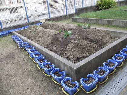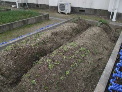 「菜の花」と「水仙」の花壇に、何か新しい植物が植わってました。