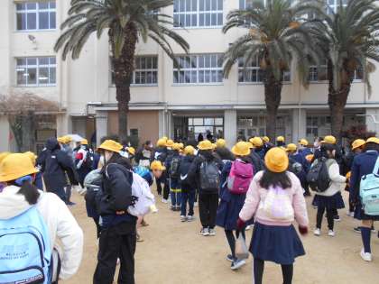 6年生が卒業遠足で金閣、京都東映太秦映画村に行きます。寒さが厳しい中、元気に出発しました。