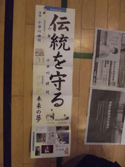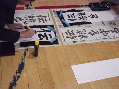 「伝統を守る」。心静かに書く子もいれば、ササッと筆を動かす子も…。いろいろでした。