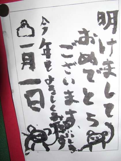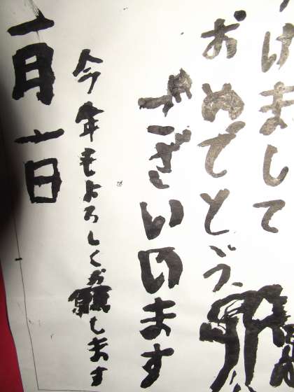 2号階段踊り場には、毛筆の「年賀状」が何枚か貼りだされていました。