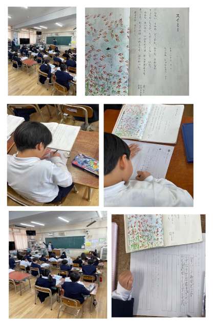 担任の指示をしっかり聞いて、準備されたワークシートに「スイミー」について、文章からわかったことを書き込んでいました。「スイミー」は、子どもたちにとってとても親しみやすい内容となっています。一匹ずつは無力でも、みんなで力を合わせれば、・・・。勇気の意味を知って、力づけられることでしょう。