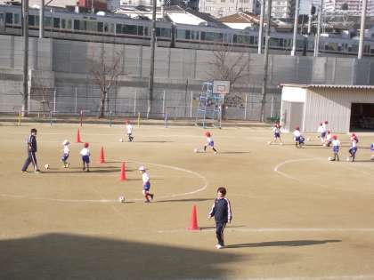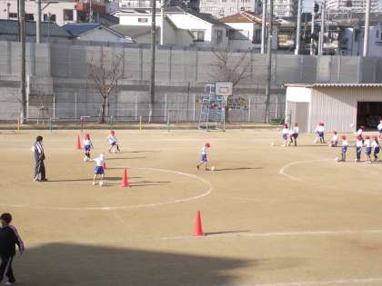 小さいお友達は、まだ足でボールをコントロールするのは四苦八苦でした。