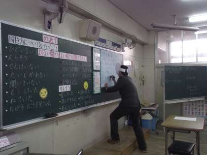 昨日、2年生のお友達が「聞き方名人になる」勉強をしました。よその学校の先生も来てくれました。授業の中で耳の大きい「キクンジャー」も登場しました。お友達が考えた聞き方名人アイウエオは、相手の顔を見て、いい姿勢で、うなづきながら、笑顔で、最後まで聞く でした。