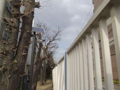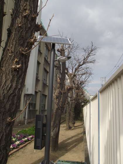 多分、まだ紹介してなかったと思うので…。小学校南東角にソーラの街灯が設置されています。
