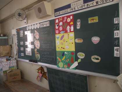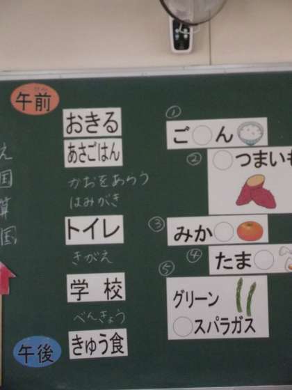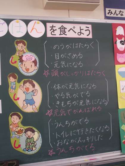 2年生のお友達が栄養師さんと「朝ご飯」について勉強しました。みんなの起床時間を聞くところから始めると、5時半とか6時とか7時半とか結構早い時刻に起きている子もいました。食べ物クイズは簡単でしたので、みんなすぐできました。