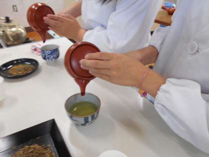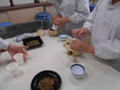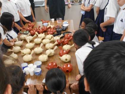 5年生が家庭科でお茶について学習しました。お茶はどこからきたの?から茶器についての講話からスタート。茶葉の色、形、匂いなど違いがあることに興味津々でした。