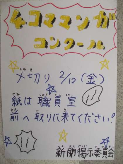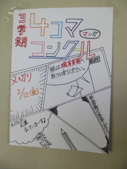新聞掲示委員会が、「4コマ漫画」を募集しています。どんな4コマ作品が出てくるのかな。