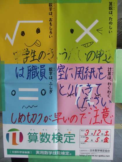 3月12日(土)に「算数検定」が開催されます。申し込みは今週の金曜(2月5日)までです。算数は楽しい。計算はワクワク。数学はおもしろい。数学は不思議。さあ、あなたも「算数検定」にチャレンジしてみませんか。