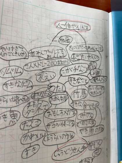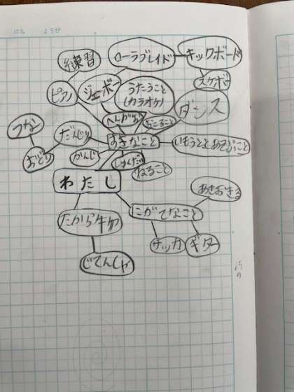 昨日、一人一人の児童が、「自分のことをもっとみんなに知ってほしい、伝えたい」ということで、ノートに樹形図をかきました。知ってほしい、伝えたいことは何か、その理由とエピソードを考えながらワークシートに書き込んでいました。