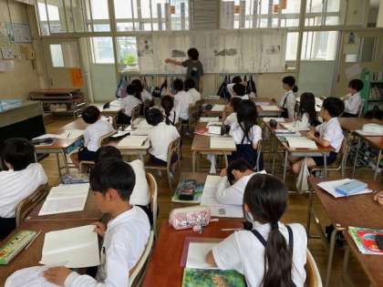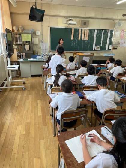 3年の国語科の授業の様子です。「ワニのおじいさんのたから物」の単元で、「なぜ、ワニのおじいさんはおにの子にたから物の場所を教えたのかを考えよう」という学習でした。今までの学習内容を振り返りながら、ノートに自分の考えを書いていました。