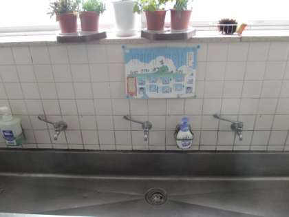 子どもたちが使う「手洗い場」にも手の洗い方をかいたポスターを貼ってます。