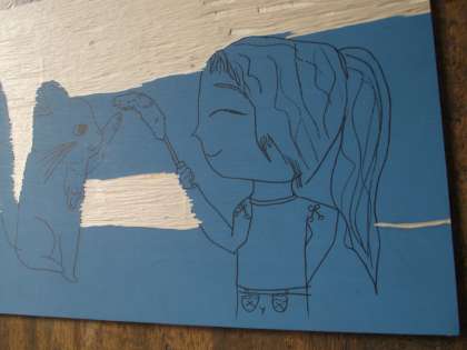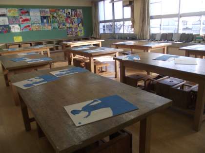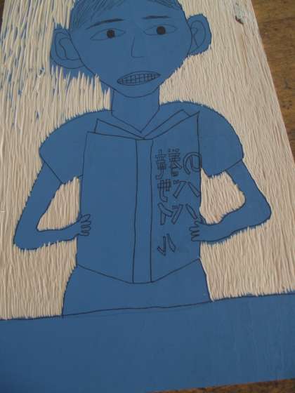 校舎を回っていると、無人の図工室にあかりが灯っていました。入ってみると、削りかけの版木がありました。