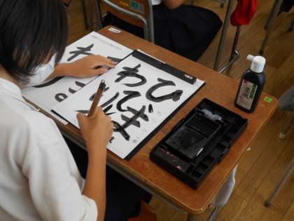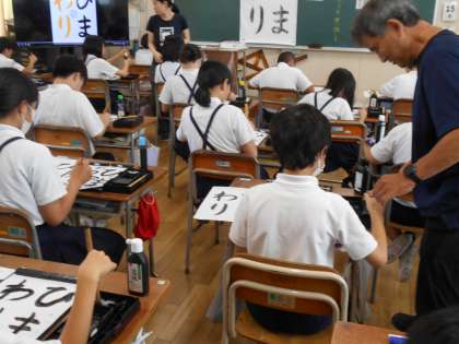 習字の学習です。「とめ」「はらい」「はね」に気をつけて書いています。書き終わった後も1枚の半紙に何度も各々が気になる箇所を繰り返し練習していました。