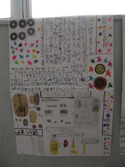 3年生のお友だちが、「昔」の事をいろいろ調べて壁新聞を作っています。3年教室前廊下に掲示されています。お時間あれば見に来てください。まずは、昔のお金です。