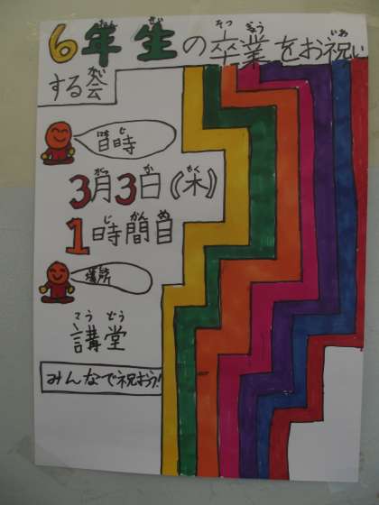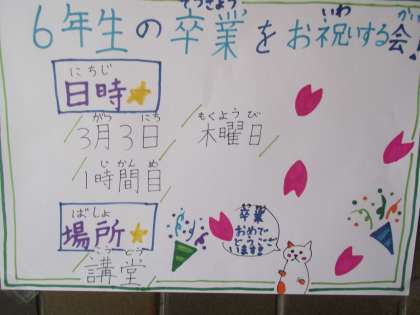 3月3日(木)1時間目に児童会主催の「6年生の卒業をお祝いする会」が体育館で開催されます。お世話になった、お兄さんお姉さん、ありがとうございます。