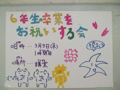 3月3日(木)1時間目に、児童会主催による「6年生の卒業をお祝いする会」が体育館で開催されます。6年生のお兄さんお姉さんに、1年生2年生3年生4年生5年生が「ありがとう」を言います。