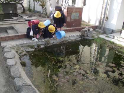 透明水槽でメダカさんと友達になっていたのは、6年生の人たちでした。で、卒業を控えたこの時期、メダカさんをもともとのビオトープに返すというので3月7日放課後、そのセレモニーに同席させてもらいました。