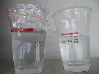 多分、蒸発の実験だと思うのですが、前回撮影した時より、水の量は減ってました。