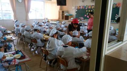 1年生も6年生にお手伝いしてもらい、 時間通りに食べ始めることができました。